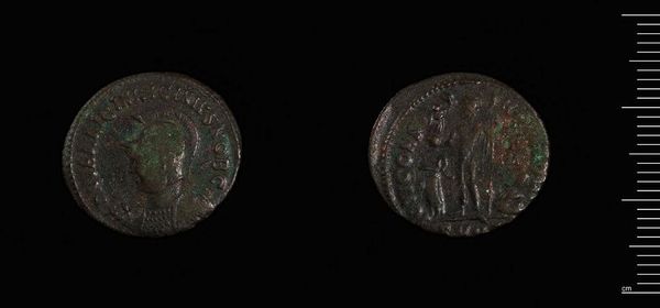 Editor: This is a bronze coin from Hypaepa, possibly from Trajan's reign, made by Loukios. It's amazing how much detail they fit on something so small. What catches your eye about its composition? Curator: The coin's circular format immediately structures our perception. Notice how the incised lines create both the portrait and the figure, dictating the coin's visual weight. The patinated surface, too, contributes to the aesthetic experience. Editor: So, the lines and texture are key? Curator: Precisely. The interplay of positive and negative space, defined by these deliberate incisions, crafts the coin's visual narrative and material presence. Does analyzing it formally change your initial perspective? Editor: It does, I'm now seeing it as a design, not just an artifact. Curator: Indeed, by focusing on the visual elements, we gain a deeper appreciation for its artistic intent.