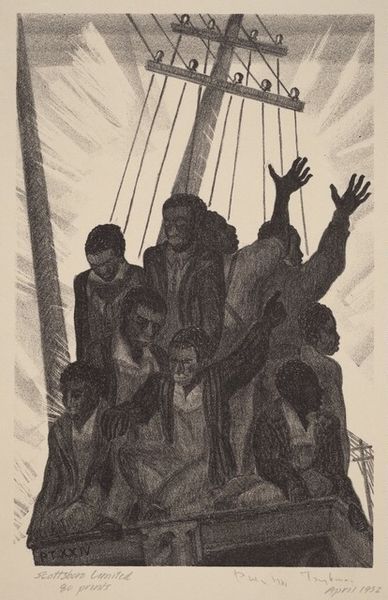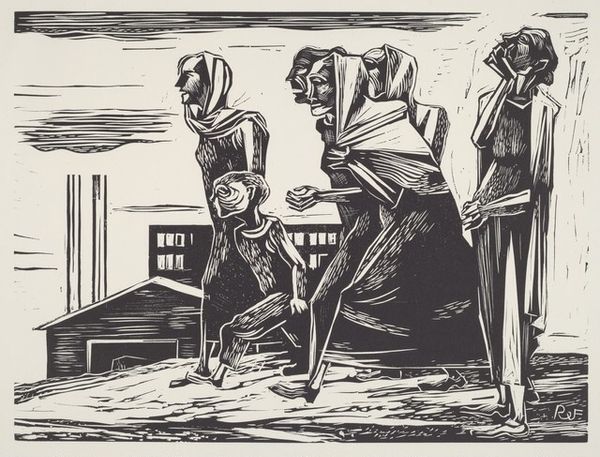 Editor: Here we have Philip Herschel Paradise’s print, “Mercado de Las Flores.” The grayscale and the depiction of everyday people reminds me of the documentary photography movement. What stands out to you? Curator: The texture and visible labor behind this print intrigues me. Notice the hatching and cross-hatching creating volume. This isn’t a seamless, mass-produced image, but something worked on, considered, handmade. Editor: It really does highlight the *making* of art, as opposed to the finished product! So, in your view, is the “craft” more important than its aesthetic value? Curator: It asks us to consider what constitutes "value," and where that resides. The artist's hand, their time and effort rendered visible, are just as crucial as the depiction of the women working in the flower market. Consider the paper, the ink – materials extracted, manufactured, transported. Editor: Oh, I never thought about it that way. Do you mean everything has a backstory about the product’s value and accessibility? Curator: Exactly! The context shapes how we understand what we're seeing. How did this artist have the resources to create, print, and circulate this image? What socioeconomic factors shaped this flower market itself, the clothing the workers wear? These questions open up the reading to the bigger picture. Editor: Thinking about the labor involved definitely gives me a deeper appreciation for not just the image, but everything that went into making it. Curator: Precisely. By foregrounding process and materials, "Mercado de las Flores" becomes a rich visual text loaded with implications about labor and class.