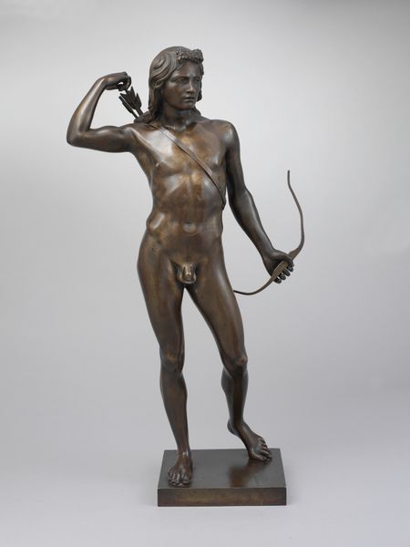Curator: Oh, my. What an odd character caught mid-dance! Editor: Precisely! And he embodies the chaotic joy often associated with these sylvan figures. The artist, C.C. Peters, cast him in bronze back in 1853. The piece is entitled "A Dancing Faun Playing the Double Flageolet." Curator: Double flageolet! What an ingenious, or should I say, an unsettling way to hold the instrument—pinned through his mouth? The piece makes the instrument a rather dominating attribute! I am struck by the artist's rendering of Dionysian ecstasy here—both musical and movement seem strained, as if captured right at its crescendo. Editor: I find his positioning striking. He’s poised, weight resting on one foot, seemingly arrested mid-leap. Look at the curvature of his back, mirroring the trajectory of the pipes. The contrast between the polished bronze and the figure’s lively disposition is also intriguing. Curator: The pipes suggest a liminal space—between wild nature and nascent civilization, if we take musical instruments as indicative of cultural refinement. Remember, fauns belong to a very ancient pantheon and embody humanity’s ambivalent relationship with the wilderness. It could reflect an anxiety about the uninhibited aspect of human nature barely kept at bay by the veneer of progress. Editor: You’re drawing on his mythical baggage and interpreting him as some symbol, while I see pure compositional rhythm. Peters has achieved a marvelous synthesis of form and movement within the strict confines of the Classical Realism. It's so poised—dare I say academic? It certainly contrasts with the subject's inherent untamability. Curator: Maybe both? After all, every symbol is itself a particular convergence of lines, forms, and mass—an emblem shaped by its medium, by a dance between order and chaos. Editor: It makes sense—let’s end there!