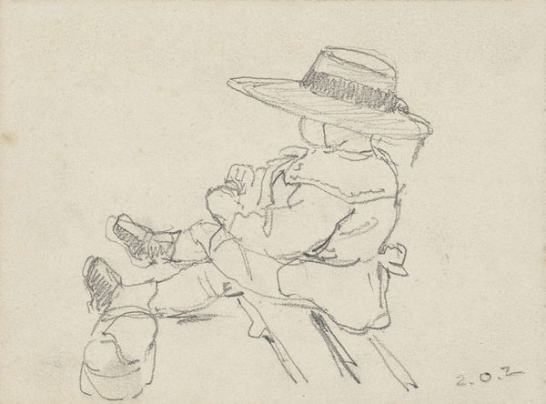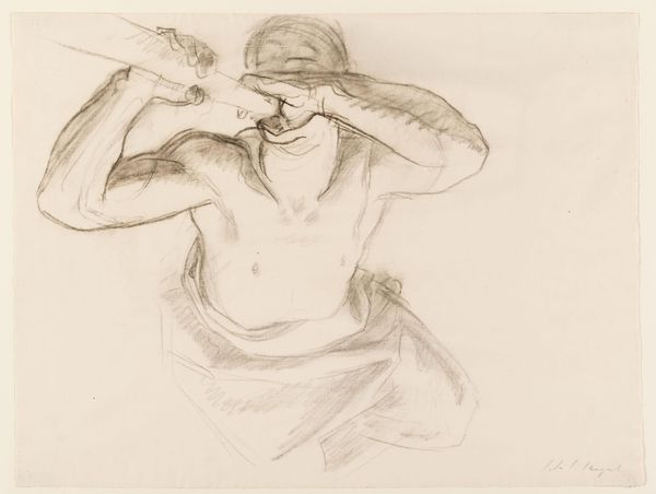 Curator: Let's discuss Walter Shirlaw's pencil drawing, "Back of a Man with Pole," created between 1870 and 1877. Editor: This is a powerful study. I'm immediately struck by the subject's stoicism conveyed through the lines, how would you describe the formal elements at play here? Curator: Notice the masterful use of hatching and cross-hatching to define the musculature of the back and shoulders. The line work suggests both volume and texture, doesn't it? How do the gradations of light and shadow affect your perception of the figure? Editor: It's quite dynamic, considering it's just pencil on paper. The artist really captures the weight and presence of the figure. Curator: Indeed. The composition draws our attention to the interplay between light and form, which shapes a unique and coherent pictorial structure. Now, tell me, what do you think of the placement of the pole across the figure's shoulders and its visual impact on the work? Editor: It adds a layer of depth and intrigue, perhaps hinting at labor or a journey. It really creates an arresting diagonal line that draws your eye from one side to the other. Curator: Precisely. This element, combined with the visible and assured quality of the mark-making, amplifies the feeling of strength and resolve embodied by the figure. We find unity between form and function in the simplicity of the chosen media and subject. What I take away from it is that art’s potential lies within its material means. Editor: It's incredible how much Shirlaw achieves with a single medium, a starkness I'm only now understanding thanks to your explanation of form. Curator: My pleasure. Observing artwork in this way can provide fresh perspectives that enhance both our creative output and personal reflection.