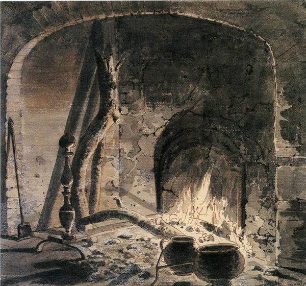 Editor: This is Ralph Hedley's "The Old Kitchen," painted in 1893, using oil. The overall effect is quite somber, focusing on this incredibly detailed, cavernous hearth. What jumps out at you? Curator: The painting is successful, structurally. The artist’s precise arrangement of forms and lines directs the eye into the space. Consider how the stonework creates a sense of recession, a subtle gradation of tones guiding you back to the vanishing point. The geometry in the stonework and timbers offers an intriguing scaffolding. Notice the strategic use of light, emphasizing textures and creating a focal point around the hearth itself. The light enhances the structural composition. Do you see how it enhances a semiotic reading of decay? Editor: I see what you mean about the light and structure working together. So you’re focusing on how the arrangement helps convey this feeling of the old kitchen and its slow degradation? Curator: Precisely. Forget, for a moment, what the painting *represents*. Consider how Hedley orchestrates elements, and ask, "How does the composition achieve this specific affect?" Editor: I see now how the way the forms are composed truly reinforces that mood. Looking at it from a formalist point of view makes it a completely different experience. Curator: Indeed. It highlights how a deeper investigation can come from even the simplest forms. We can interpret much, even from mundane subject matter. Editor: I definitely agree! Thank you.