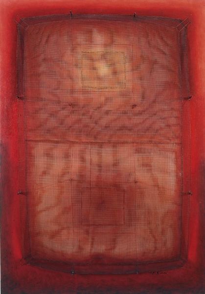 Manuel Rivera created "Espejo vestido de rojo," a painting which immediately envelops us in a dominant field of red. The canvas is structured by a taut grid of wire overlaid on a textured, clouded background, creating an interplay between the defined geometry and the blurred depth. The use of red—both vibrant and subdued—evokes passion, but also restraint, as if a powerful emotion is being carefully contained. Rivera was associated with the Spanish Informalism movement, which turned away from academic formalism. In "Espejo vestido de rojo," the contrast between the rigidity of the wire and the fluidity of the painted surface suggests a challenge to conventional ways of seeing and representing reality. The semiotic tension here lies in how the grid, a symbol of order, attempts to control the chaotic, unpredictable nature of the painted field beneath it. The painting operates at the intersection of control and release. Consider how its components create a visual system of signs and cultural codes that push the boundaries of perception and understanding.