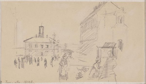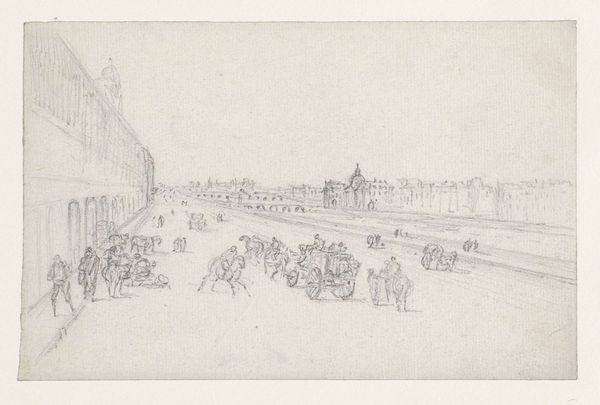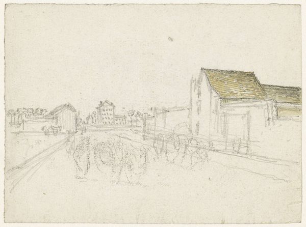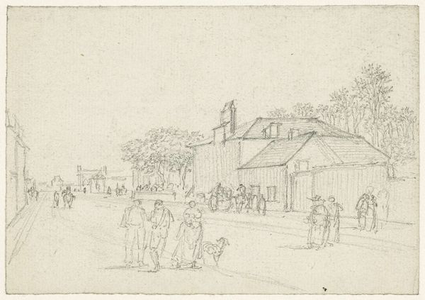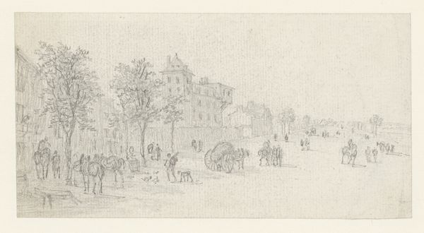 Curator: This delicate drawing, “Een cour tussen twee corps de logis,” by Georges Michel, captures a courtyard scene with a hushed, almost ethereal quality. The medium is pencil. What's your immediate impression? Editor: The first thing that strikes me is its fleeting, dreamlike nature. It's as if the artist captured a memory just before it faded away. The light pencil work gives everything a fragile, temporal feel. I’m thinking of communal space as memory palace... Curator: Indeed. Michel, working in the late 18th and early 19th centuries, was deeply engaged with capturing specific locales and this drawing allows us a glimpse into the kind of spaces of commerce that helped support larger economic networks. Note the buildings flanking the scene, presumably lodgings, flanking the open trading spaces. How might this arrangement inform us about class relationships? Editor: That architectural arrangement certainly reflects societal hierarchies. And consider the trees, evenly spaced, offering shade but also signifying order, control. Visually they feel as though society has shaped nature. Does this controlled symmetry enhance feelings of safety for its users? Curator: A pertinent point, this controlled composition may reveal wider aspirations and societal attitudes towards commerce, in which the balance between productivity and stability can also shape expectations and values of an elite social stratum. Editor: Absolutely. What also catches my eye is the faint yet discernable presence of figures and carriages. Their symbolism and interaction, even in such a light rendering, hint at the purpose of the courtyard as a center of daily exchanges, trade and status updates in pre-industrialized hubs. They also inject life and rhythm to the space itself. Curator: Precisely, the drawing illustrates how space shapes behavior. These faint lines indicate how integral the design and function of this courtyard are. By bringing structure to commerce it ultimately creates a network. It seems the buildings define commerce and community life in those days, serving as visible manifestation of established hierarchies. Editor: Considering it further, it seems as if through these images the artist offers glimpses into lost societies where cultural values of social engagement were intimately bound to specific architectural settings—aren’t we all looking for similar social anchors? Curator: You've articulated that connection beautifully. It's intriguing to realize that an artwork from over two centuries ago continues to offer us valuable points about both historical society, the changing meaning of progress and social memory. Editor: Agreed.