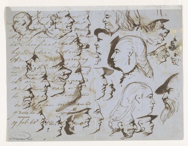 Johannes Tavenraat created this study in pen and ink, a medium prized for its directness. The quick strokes and light washes on the paper create a sense of immediacy, as if the artist were capturing fleeting impressions. Note how Tavenraat uses the inherent qualities of ink – its fluidity and capacity for fine detail – to define the faces and caricature the subjects, with the bare minimum of marks. Drawing, especially in this form, carries a social significance, representing the artist's skill and practice. Tavenraat likely engaged with academic traditions, using drawing as a means to understand form and expression. But he also took it into the realm of social observation and biting wit, creating a powerful effect of raw, unvarnished humanity. Ultimately, this drawing challenges any hard line between fine art and everyday practice. It reminds us that all art making is rooted in material and process, and that even the simplest tools can convey complex meanings.