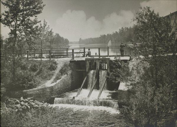 Curator: Let's turn our attention to "Sluis in kanaal," a gelatin-silver print created anonymously around the early 1900s to 1910s. What strikes you first about this image? Editor: An immediate impression is one of contained power. The geometric rigidity of the dam is starkly juxtaposed against the organic forms of the landscape—an imposition of industrial will upon the natural world. Curator: Absolutely. And understanding the context, this photograph gestures to broader issues of labor, environmental transformation, and even colonialism. The canal suggests an infrastructure project likely driven by economic or strategic imperatives of the time. The symbolism is compelling, almost monumental, wouldn’t you say? Editor: Indeed, I'm drawn to the symbolic weight of water. Throughout history, it's embodied notions of life, purity, and cleansing, but here, harnessed by human construction, it speaks to control, modification, perhaps even domination over nature's course. The covered structure overhead takes on an almost temple-like aspect. Curator: A temple indeed – a temple of progress, one might say. Consider also that Pictorialism, one of the styles connected to this work, aimed to elevate photography to the status of fine art by emphasizing aesthetic beauty and atmospheric effects. What implications does this have for our interpretation, especially when dealing with a scene rooted in concrete social and political realities? Editor: The pictorial elements certainly invite contemplation on a deeper psychological level. Note how the photographer utilized soft focus to render a certain ambiguity, blurring details and softening the industrial lines. This creates a visual language rich in cultural symbolism. I find myself searching for meaning embedded in the composition. Curator: The photograph definitely invites layered interpretations, reflecting its era’s complex relationship between industrial advancement, colonial expansion, and artistic expression. I appreciate the connections you've drawn between its formal elements and underlying narratives. Editor: It is an arresting convergence of raw strength and concealed layers, the imprint of an era etched within the stillness of the image.