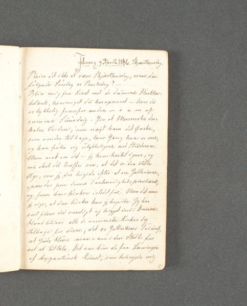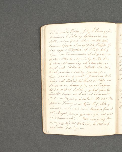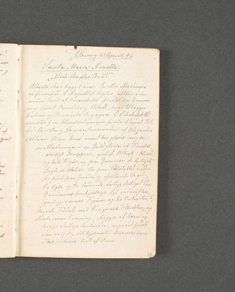 Curator: This work by Johan Thomas Lundbye, entitled "Rejsedagbog. Firenze," or "Travel Diary. Florence," was created in 1846. It’s a page from one of his sketchbooks. Editor: My first impression is of a quiet intimacy. The cramped script on aged paper evokes a personal narrative. Curator: Absolutely. Crafted using pencil and pen on paper, the medium speaks volumes. These are not finished works meant for exhibition but working documents of an artist’s process. Lundbye wasn’t just recording the city; he was engaging in the labor of seeing and understanding. Editor: Precisely! The materials dictate the form—the texture of the paper, the graphite catching the light—contribute to the overall effect. Observe the variation in line thickness, the deliberate structuring of the page itself, a frame within a frame, setting the hand written elements up as part of a bigger image structure. Curator: The text itself offers insights. He references figures like Michelangelo and Verrocchio. By transcribing such reflections directly beside sketches, Lundbye creates a multilayered palimpsest, fusing textual analysis with visual rendering. His raw material isn't just Florence; it's the entire artistic tradition he encounters. Editor: I’m drawn to how the linguistic components serve as a compositional counterweight to the more visually distinct aspects. He appears less interested in objective representation, and instead seems driven to convey his sensory, perhaps even spiritual experiences. Curator: I concur. It’s a testament to Lundbye's approach and romantic sentiment. Editor: A small window into a specific moment.