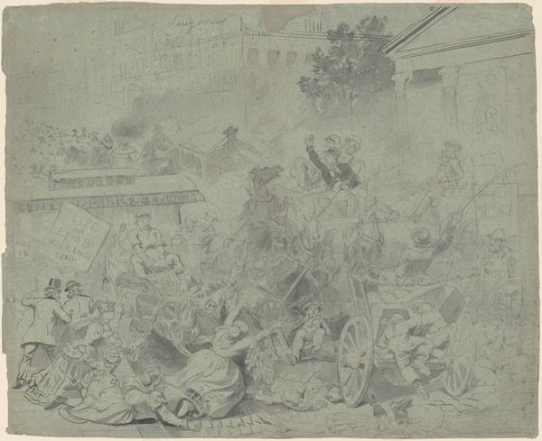 This promotional card for Wm. S. Kimball & Co. Cigarettes presents an arena scene, chaotic and visceral, rendered in monochrome. Immediately, one is struck by the composition: the circular arena packed with spectators frames a central space where figures, animals, and objects are caught in dynamic disarray. The use of line and texture creates depth. The artist's choices invoke structural themes around spectacle and power. The scene reflects a semiotic system where athletic prowess, danger, and entertainment intertwine. The image, designed as commercial art, challenges fixed meanings of athleticism. Instead, it suggests the spectacle of violence and the marketing of a concept. In its formal qualities, the interplay between the controlled space of the arena and the unbridled action within forms a stark contrast, emblematic of a culture grappling with representations of conflict and strength.