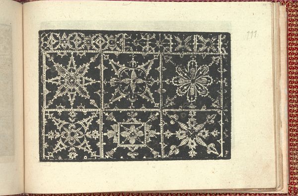 This is a page from 'Corona delle Nobili et Virtuose Donne', a book made by Cesare Vecellio around 1592, using woodcut and letterpress. The contrasting monochrome image, with its dense patterns, creates a striking visual texture. Here, geometry is the guiding principle. Each design element—squares, triangles, circles—is meticulously arranged, creating a structured yet dynamic composition. The artist employs a semiotic system of signs, where each shape and motif carries a cultural code that speaks to the values and skills associated with noble women. Consider the interplay between the solid forms and the negative space, a balance that challenges fixed meanings, and highlights new ways of thinking about representation during the Renaissance. The rigid structure is less about ornamentation and more about the philosophical pursuit of order and knowledge. This approach encourages us to question our understanding of aesthetic beauty and its connection to broader intellectual movements.