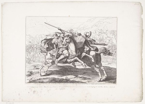 Curator: Here we have “Ruiters en voetknechten,” or “Horsemen and Foot Soldiers,” a woodcut and engraving crafted in 1537 by the Northern Renaissance artist, Hans Schäufelein. Editor: What immediately strikes me is the intensity of detail, a symphony of textures created by intricate lines. It almost feels sculptural despite being a two-dimensional print. Curator: Indeed, Schäufelein was operating in a period of significant shifts in the representation of power. This work, likely commissioned, showcases a regimented military display. Notice the symbolic adornments, the emblems of power woven into their garments and weaponry. This wasn't just about documenting; it was about projecting authority and order during a time of considerable social upheaval with the Reformation brewing. Editor: The composition itself reinforces that sense of order. The figures are stacked, yet distinct, their gazes carefully arranged. I’m particularly drawn to the tonal range achieved with such a limited palette—the deep blacks offering a dramatic contrast against the stark white of the paper, creating a real dynamism. Curator: The choice of woodcut and engraving is interesting too, offering both accessibility, allowing for reproduction and widespread distribution, and allowing an impressive level of fine detail, which we see clearly in their attire and equipment. This also reflects on a more general trend to spread ideals during the religious reformation in Germany and to spread more personal art to people of different classes. Editor: Look at the almost playful treatment of light! The subtle gradations lend volume and weight to these figures. See, for instance, the texture and implied shape in the rounded caps and hats. I find these small touches to be remarkable. Curator: It speaks volumes about the patronage system of the time, doesn’t it? Commissioned art became a method for political positioning and legacy making. Schäufelein had clearly mastered capturing the nuanced needs of his patrons. Editor: Ultimately, I’m left impressed by Schäufelein's mastery. The line work, the composition... everything feels incredibly deliberate and effective. Curator: And for me, the print serves as a fascinating snapshot of its historical moment, reflecting both artistic skill and political aspirations.