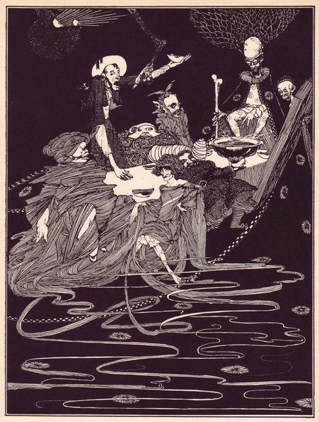 Editor: Dorothy Lathrop's "The Treasure of Carcassonne," created in 1928, is an intricate ink drawing. There’s a sort of eerie beauty to it. What initially jumps out is the strange, almost surreal quality of the imagery, like a dark fairytale. How do you interpret this work? Art Historian: Indeed. Notice how Lathrop employs potent symbolism. We see figures suspended in an aquatic space: a woman perhaps drowning above, a mermaid reaching, a monstrous figure to the left. The aquatic realm often signifies the unconscious in cultural memory – a space of hidden truths and suppressed emotions. Do you see how the linear quality emphasizes this sense of unveiling, of digging beneath the surface? Editor: I see that now. The stark contrast between black and white makes everything feel more dramatic, heightening the sense of danger and mystery. Art Historian: Precisely. The treasure, hinted but not fully revealed, is the submerged self, confronting these fantastical beings that embody fears and desires. These may symbolize challenges and guardians we encounter when exploring the hidden aspects of our psyche. What narrative or mythic parallels do you see emerging in your mind as you view this illustration? Editor: Maybe a twisted version of a rescue story? I thought of Orpheus descending into the underworld. So it is not about a literal treasure then, but the unveiling of the inner self? Art Historian: That's a fascinating connection. Lathrop taps into something deeply rooted in the collective psyche. The visual language echoes enduring narratives about confronting inner demons and psychological transformation. By using those symbols Lathrop enables this artwork to be emotionally stirring. Editor: That's a completely different way of seeing it than I initially thought! I was so focused on the surface-level fantasy, but it is really more of an illustration of diving deep within. Art Historian: Exactly. Recognizing symbolism allows us to see these types of narratives mirrored in art. The artwork reveals cultural memory by invoking feelings connected to our psychological realities.