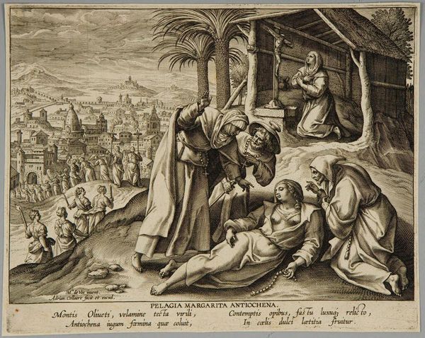 Curator: Let’s look at Makovsky's "Meeting of Isaac and Eleazar" from 1858. Made with oil paint, it has such a strong storybook feel. I’m initially drawn to the bright palette contrasting against that tent. How do you interpret this work? Editor: It's such a busy composition, isn't it? So many figures. It feels…staged almost. But what strikes me are the sumptuous fabrics everyone's wearing – the reds and yellows really pop! Do you think the materiality of those fabrics would have had any impact on how viewers at the time would interpret the piece? Curator: Absolutely. The choice of oil paint allows for rendering those textures and the perceived value of such opulent fabrics points directly to issues of social status and consumption. Think about who commissioned works like these – it’s about presenting and celebrating material wealth, even in religious narrative. Are we really meant to focus on spiritual devotion? Editor: So, you're saying the 'fine art' elevates the patrons by showcasing accessible, desirable, expensive material through 'common' narratives? That’s quite cynical. Curator: Maybe not cynical, but critical. Consider also how the labor required to produce and dye these fabrics is entirely absent from the image, masked by the 'divine' subject. The actual process, the means of production, remains hidden, perpetuating an idealized and somewhat deceptive narrative. Editor: It really does put it in a different perspective. Seeing it this way, shifts the meaning significantly. I see the staged scene in a new light as well: not just telling a biblical tale but highlighting a societal one, using readily consumable high-status artistic resources. Curator: Precisely! By understanding the means through which it was produced we start to decode not just the narrative in the painting but of its own presence in society. Editor: Thanks, this was helpful. I have to rethink how I view historical painting now, and not only look at style and 'historical context' but what that material and painting REALLY says.