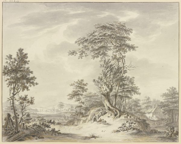Carel Lodewijk Hansen made this tranquil landscape using watercolor and pen with brown ink. Watercolors, typically seen as a preliminary medium, were often used for topographical studies and allowed artists to capture subtle gradations of light and atmosphere. Here, Hansen masterfully renders the scene with delicate washes and fine pen lines. The material qualities of watercolor lend themselves perfectly to the soft, diffused light of the landscape, creating a sense of depth and atmosphere. The presence of the windmill and the wagon filled with hay gives insight into the local agricultural activities. The figures on the wagon are a tiny detail, but speak to the labor involved in transporting the crop. By focusing on the craft of watercolor painting and the social context of rural life, we can gain a deeper understanding of this seemingly simple artwork, moving beyond traditional distinctions between art and craft.