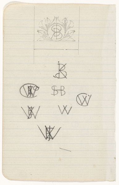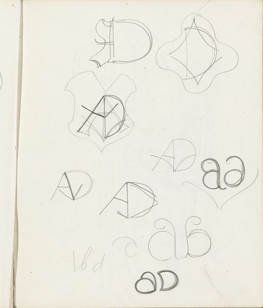 Gerrit Willem Dijsselhof created these 'Designs for monograms' with pencil. The layout consists of six distinct monogram designs arranged in two rows that, together, invite us to consider their intricate, geometric construction. Note the interplay between the letters 'A' and 'G' in the top row, each variation playing with the relationship between these two forms. Dijsselhof is manipulating their positive and negative spaces. Notice how the forms become intertwined yet remain legible. The lower row transitions from geometric to organic forms with floral motifs subtly incorporated around the 'BI' monogram. The arrangement of these designs on the page emphasizes the artist's methodical exploration of form and space. The use of pencil allows for fine, precise lines and shading, underscoring the delicate balance between clarity and complexity, reflecting Dijsselhof's interest in both symbolism and the decorative arts. In viewing these monograms, we appreciate how graphic design can be elevated to the realm of fine art through thoughtful composition.