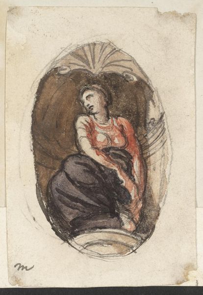Curator: I find myself immediately drawn to the figure’s posture – burdened, almost as if pushing against reality itself. Editor: And rightly so. This is William Blake's "First Book of Urizen, plate 21," currently housed at the Tate. Urizen represents reason and law in Blake's mythology, and here he seems to be shaping or constrained by a fiery sphere. Curator: The sphere is such a powerful visual element. It feels like a womb, or a prison – or perhaps both simultaneously. Given Blake’s personal mythology, is this sphere a symbol of Urizen’s self-imposed limitations, his attempt to confine the boundless? Editor: Precisely. The image, like much of Blake's work, challenges rigid systems and celebrates imagination. Notice the almost spectral lion lurking nearby. It adds a dimension of natural, untamed power that Urizen seeks to control. Curator: And there’s a tension between the sharp lines of the frame and the fluidity of Urizen's form. Blake's challenging us to see beyond the constraints of reason. Editor: Indeed. Blake used art as a tool to critique the politics of imagery. This work invites us to question the structures that limit our perceptions. Curator: A truly complex symbolic work that resonates through the ages. Editor: Blake's vision makes us reflect on the constant struggle between order and freedom.