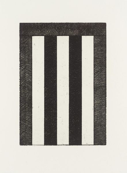 Editor: This untitled etching by Brice Marden features a textured black rectangle framed by white borders. It feels very architectural to me. What historical influences might have shaped Marden's minimalist approach? Curator: Well, think about the late 20th century. Institutions were grappling with representation after movements like Pop Art challenged the established art world. How does this etching, with its stark simplicity, position itself within that dialogue? Editor: I guess it's a reaction against the chaos and commercialism, maybe a return to basics? But is it just about aesthetics, or is there a social commentary here? Curator: Minimalist art often invites viewers to find their own meaning, but remember, the context of its creation is crucial. How might galleries and collectors have influenced Marden’s artistic choices and the reception of his work? Editor: So, the art world itself becomes part of the artwork's meaning? That's a really interesting point! Curator: Precisely. By understanding the cultural landscape, we can better appreciate the complex layers within even the simplest forms.