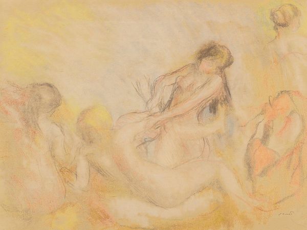 Curator: Take a look at this intriguing work by Pierre-Auguste Renoir, created around 1907, titled "Femme Nue Et Paysage," which translates to "Nude Woman and Landscape." Editor: It's instantly dreamlike. The hazy edges and soft colors... the nude almost blends into the landscape as if she’s emerging from it or dissolving into it. Curator: Absolutely. It exemplifies Renoir’s late style, where the distinction between figure and background blurs, focusing more on color and light. You see that distinctive brushwork too; how he builds form with short, soft strokes. Editor: It’s definitely of its time. While I can appreciate the impressionistic technique, the subject matter does feel... loaded. There’s this casual juxtaposition of the female body with the landscape that evokes a sense of possession, a tradition within art history. It's pretty common but always worth noting. Curator: True, but consider Renoir’s personal context. He was known for his idealization of the female form, seeing women as symbols of fertility and beauty, tying into his overall celebratory approach to life through art. The "plein-air" nature, painted outdoors, speaks to the time period as well, of leaving stuffy closed environments. Editor: That idealization itself is a product of a patriarchal gaze. Representing women as timeless, passive muses rather than active agents reinforces a problematic dynamic. This is made even more apparent because of his landscape treatment. Renoir’s technique might veil the deeper structures present but doesn't make them unexistent. Curator: I think we also need to remember that Impressionism often rejected the formal constraints of the Academy in favor of capturing fleeting moments and subjective impressions of beauty. Editor: Which doesn’t negate that the way one experiences beauty depends heavily on socio-historical location. Curator: Perhaps. But overall, there's a powerful sensuality present in "Femme Nue Et Paysage," which ultimately invites us to reflect on beauty in many different ways, and understand what Renoir meant for his moment. Editor: Indeed, seeing this painting with critical eyes, acknowledging the layered, complex interplay between the artwork itself, society and the artists intention certainly generates great insights.