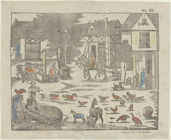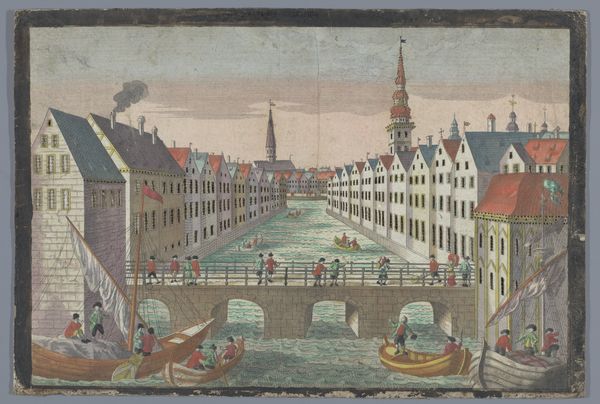 Editor: Here we have "View of the Rotterdam Gate and the Ketel Gate in Delft," a print created between 1742 and 1801. It's attributed to Georg Balthasar Probst and uses a mixed media of engraving and watercolors. I’m struck by the composition; it feels very balanced, almost staged. What do you see in this piece from a formal perspective? Curator: What strikes me first is the interplay between line and color. The artist employs crisp, precise lines, particularly in the architectural details, contrasting with the softer, more fluid application of watercolour washes. Notice how these washes define the sky and water, creating depth and atmospheric perspective. Editor: I see that! The sky almost seems to fade into the distance, unlike the more defined buildings. Is there a particular purpose to this contrast? Curator: Precisely. Observe the sharp angles of the buildings compared to the gentle curves of the arches and the human figures. Probst constructs a visual hierarchy, leading our eye from the immediate activity on the street towards the vanishing point within the architectural space. Note too how the artist modulates tone to distinguish various planar recessions. Editor: So, it's all carefully designed to guide the viewer. Does the limited palette play into this at all? Curator: Certainly. The restrained use of colour—mainly earth tones with subtle hints of red and blue—contributes to the print’s overall sense of harmony and balance. It also allows the details in the linework to become more prominent. Do you notice any specific shapes, patterns or elements recurring in the image? Editor: The rectangles! Windows, buildings… even the shapes in the square tiling contribute. It almost feels mathematical! I never noticed how much the lines draw my eyes through it all before. Curator: Exactly. It is through these considered artistic choices that Probst is able to construct the image, controlling the eye through geometric shapes and planes and an acute manipulation of media to achieve balance, harmony, and perspective. It is interesting to think of the architectural portrayal in that manner.