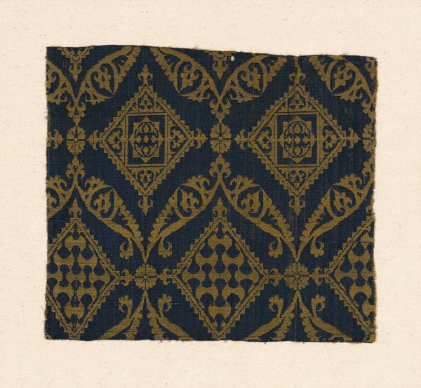 Curator: Here we have an intriguing textile work from the Rijksmuseum, created sometime between 1920 and 1930 by Theo Nieuwenhuis. It’s titled "Ingeschoren trijp, dessin 'Duinroos', in zachtpaars op geel," which translates to something like "cut velvet, design 'Dune Rose', in soft purple on yellow." Editor: My first impression is one of restrained elegance. The patterns, despite their complexity, are softened by what appears to be a muted color palette. The density of the design is interesting too. Curator: Absolutely. The overall composition shows clear influence from the Arts and Crafts movement, with its emphasis on handcrafted design and organic motifs. Notice how the “Dune Rose” pattern is subtly interwoven with geometric forms, achieving a nice visual tension. Editor: Considering the period, it's compelling to imagine how this textile might have functioned within the domestic sphere. Was it intended for upholstery, wall hangings, clothing? The 'Dune Rose' evokes nature, aligning with the period's broader yearning to connect to landscape through everyday objects. What societal need was Nieuwenhuis hoping to fill? Curator: That’s precisely where historical context enhances our reading. Arts and Crafts responded to industrialization, valuing artisanal skills. In this textile, the repetitive patterns establish rhythm, while color choice creates gentle contrast and balance. This creates the intended design, one that suggests harmony within a geometric framework. Editor: The use of muted colours could have been a design choice to match certain interior fashions during its time, adding warmth to rooms. Alternatively, the artist may have been reacting to something politically—its presence in homes would provide more context on if people accepted its design during that time. Curator: A superb point. As a scholar of formalism, my instinct is always to dissect the visual language first. However, it is also crucial to consider where such textile might hang as an art object during its life. Editor: Precisely, considering these interrelations gives the textile's existence a whole new lens of history. I appreciate that you have brought new techniques and understanding on form itself. Curator: Indeed, studying its pure construction brings the textile new appreciation, when coupled with external information that deepens understanding. Thank you for that, this exchange truly made me reflect about our understanding of design!