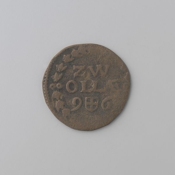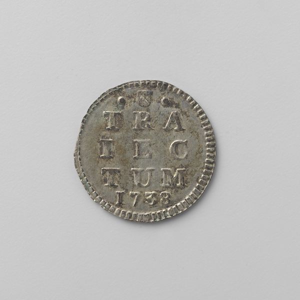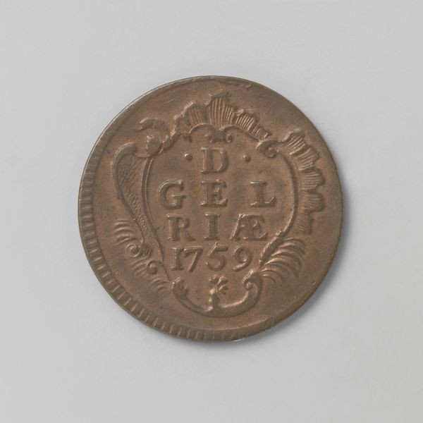 Curator: Here we have a fascinating little artifact: a silver "afslag" – essentially a trial strike – of a Gelderse halve duit, dating back to 1756. Gelderland, of course, refers to the province within the Netherlands. Editor: Tiny but mighty! It's got this quiet intensity, like a forgotten spell someone once cast over their grocery money. And that silver... it has a weight of history about it, doesn't it? Curator: Indeed. Examining its production in the context of the Dutch Golden Age, we have to acknowledge the socio-economic hierarchies it represents. Coinage like this signifies not only economic power but also the control and dissemination of visual language supporting the ruling classes. Consider the impact of repeatedly seeing these symbols and names – "Gelria," the Latin name for Gelderland, reinforced through daily exchange. Editor: Oh, absolutely. But stepping away from the discourse for a sec, those little flowerettes dotting the top and bottom… they’re so darn sweet against the serious pronouncements etched into the surface. Almost a subtle act of rebellion from the engraver, perhaps? A wink in the face of authority? Curator: That's a compelling interpretation. The juxtaposition of delicate floral motifs alongside the bold pronouncements of the region does create a tension. While purely speculative, we could read this as an assertion of the region's natural beauty, almost a claim against purely monetary worth – perhaps alluding to inherent values beyond mercantilism. Editor: Right? Or just because pretty flowers are cool, and make even tiny coins less dreary! Speaking of which, what is that underneath "1756"? Is that some sort of bird or insect? Curator: You have a keen eye. That would be a small depiction of an eagle, used here as a heraldic emblem, symbolising power and vigilance. Its placement here reaffirms the authority that this coin carries as legal tender. Editor: Such serious symbolism on something that probably bought you, like, a loaf of stale bread back then. It's charmingly absurd when you think about it! Almost Kafkaesque. Curator: I see your point, but I would like to propose an interpretation, using the context of Dutch mercantilism and colonial exploits during the 1700s, focusing our understanding on… Editor: Woah there! Maybe, sometimes, it’s just a pretty little piece of shiny metal with some flowers and a grumpy eagle. Sometimes the poetry is enough, you know? Curator: Well, regardless, it highlights the convergence of art, politics, and daily life in the 18th century. It certainly encourages a deeper exploration into both official histories and subjective readings of value. Editor: Agreed! I think I might just carry it around for a bit. Get in touch with my inner 18th-century capitalist.