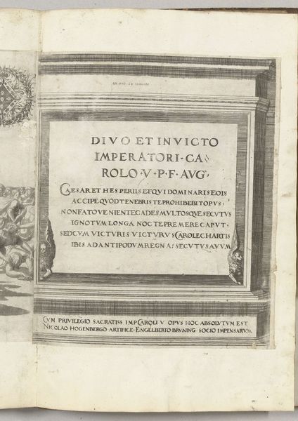 Curator: Looking at this engraving, what catches your eye immediately? Editor: It’s austere, imposing even. The tight composition, that block of text, it feels monumental despite probably being quite small in reality. The stark contrast contributes to that sense of weight and importance. Curator: Indeed. This is the title page from Nicolaas Hogenberg's print series depicting Charles V's procession with the Pope in Bologna after his coronation in 1530. Though the print is dated anywhere between 1530 to 1620. Notice how the textile, possibly tapestry, acts as a visual frame. It also contextualizes the print as it suggests a series of prints made after woven artworks. Editor: I do see that frame; that makes it seem to have multiple dimensions instead of one flat graphic-art design. That rectangular format encloses that very formal and monumental inscription. And those small cherubic figures flanking it…they provide an interesting contrast in style and texture to the heavy architectural framework. Curator: Exactly, those little cherubs add an element of playfulness or humanism. But the text is primary here, which underscores the print's function. Consider how this image introduces a whole political and religious spectacle. It announces and frames Charles V's authority visually through its inscription and design and it highlights the Pope as well. The textile itself represents, as it usually did back then, status and wealth. Editor: I agree, the typography is incredibly deliberate, each letterform precisely rendered; yet, paradoxically it is hard to read at first sight. Its complexity underscores the official gravity of the occasion. It is like looking at a modern-day bureaucratic contract, almost like visual officialese, a design. Curator: Precisely! The visual style acts as a language reinforcing the power structures in play during Charles V's reign. The use of imagery for political purposes has always been a powerful weapon. Hogenberg makes sure the viewer understands. Editor: Well, for me it does invite us to meditate not only on design choices and typography but also on the nature of graphic power in this historical series.