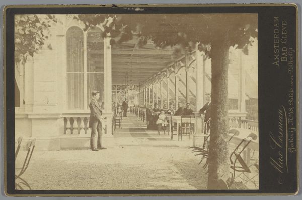 Curator: The stillness is striking. A hushed quality permeates this photograph by Charles Nègre. Editor: Indeed. Its visual architecture leads the eye straight to the family group. Their poses, however, are quite rigid. It feels like a carefully constructed stage tableau. Curator: Precisely. This is '[Lord Brougham and his Family, Cannes]', an albumen print dating to 1862. Consider albumen, derived from egg whites. It's coated onto paper to create this distinctive image. Think about the labor invested in each print, the photographer navigating collodion processes in mobile darkrooms, and the burgeoning culture of photographic portraiture. Editor: The tonal range here is limited but masterfully used. The architectural setting--the columns and symmetrical arrangement of the villa--serves to underscore the status of the sitters. It's almost neoclassical in its structured formality. The subdued palette adds to the image's sense of timelessness. Curator: Nègre was innovating new ways of capturing images in his lifetime. This is not mere documentation, but a conscious shaping of the narrative. Notice, for instance, how the landscape behind them feels equally staged, tamed—mirroring their control of space and status. Editor: The balance between light and shadow enhances the contours of their clothing and subtly defines each figure. Yet, they're all contained within this rather severe frame, dominated by horizontal lines of balustrade and the powerful vertical columns. Curator: I find it incredibly revealing how these types of portraits became integral to constructing bourgeois identity. It became a mechanism for class to further solidify during that era, visually proclaiming belonging and affluence. Editor: And by isolating such elements, we arrive at a profound insight, that Nègre's piece functions beyond the purely documentary. The composition, texture, and historical framework blend into a study of the socio-economic structures prevalent at that time. Curator: This approach has altered my perception. It encourages you to recognize historical portraiture's purpose in more than likeness alone. Editor: Mine, too. I am left contemplating how Nègre uses subtle, calculated details to underscore this portrait's silent commentary on authority.