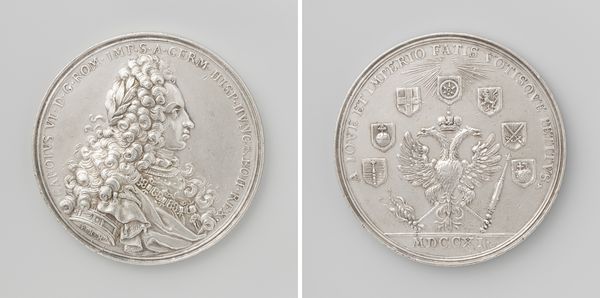 Curator: Here we have the silver medal “Eerste eeuwfeest van het aalmoezeniersweeshuis te Amsterdam,” or "First Centenary of the Almoners' Orphanage in Amsterdam", designed by Johan George Holtzhey in 1766. What strikes you first about this piece? Editor: The luminosity, definitely. The bright surface combined with the linear precision gives it an almost clinical quality, yet the grouping of figures suggests intimacy. It's quite striking. Curator: It certainly is. On one side, we see an allegorical representation of Charity, ‘Alma Mater’, or nourishing mother, seated beneath a tree. She’s guiding two children, referencing the orphanage’s role as caregiver. Note how this central figure, along with those vulnerable children, invokes a timeless sense of maternal benevolence. Editor: The arrangement is skillfully balanced. The vertical tree trunk counteracts the seated figure. The eye is drawn through careful orchestration from the cornucopia to the nurturing scene with subtle inscriptions around the edges. Curator: Absolutely. The cornucopia symbolizes the wealth and support that sustains the orphanage. And flipping to the other side, we see various coats of arms connected by what appears to be chains, illustrating the network of benefactors linked to the orphanage. The emblems point to lineage, privilege, but also obligation to support. Editor: A veritable architecture of symbolism. The formal composition speaks to neoclassical ideals, where rationality and order are paramount. But what truly interests me is how this medal functions as both a commemorative object and a piece of propaganda—a statement about civic virtue, wouldn't you agree? Curator: Indeed! Commemorative medals of this nature acted as powerful symbols of institutional pride and societal values. They were visual pronouncements of the benevolence of Amsterdam’s elite, perpetually circulating their generosity and securing their cultural legacy. Editor: It’s intriguing how the hard, reflective material adds to that sense of permanence, while also subtly highlighting the power dynamics inherent in charity. Curator: Yes, it leaves you with much to contemplate! The artistry, combined with historical context, truly brings the object to life. Editor: A compact exploration into Dutch society. It demonstrates the power of close examination and interpretation of materiality.