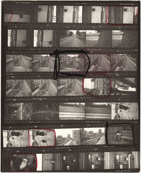 Robert Frank made this photographic work, "Guggenheim 74/Americans 46--Detroit," using a relatively commonplace technology: 35mm film. What we see here is the physical artifact of that process – a strip of negatives. The material itself, celluloid coated with light-sensitive emulsion, becomes a key part of the image. Each frame is a captured moment, a fraction of a second, yet strung together they suggest narrative, time passing. The materiality influences the appearance, from the sprocket holes that line the edges, to the grainy texture inherent in black and white film. Consider also the darkroom work required to develop these images, a skilled tradition that transforms latent impressions into visible realities. This physicality reminds us that photography is not just about pointing and shooting; it is a labor-intensive process, tied to the social and economic conditions of its production. Ultimately, by foregrounding the material and making of this work, Frank blurs the lines between documentary and artistic expression.