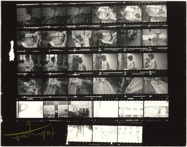 Curator: Looking at this contact sheet by Robert Frank from 1962 titled “Raoul Hague 9” what captures your attention first? Editor: The arrangement itself. It's almost like a film reel laid bare, showcasing Frank's photographic process, all the different crops give off an improvisational feel. But the selected images highlighted in orange—they beckon with an alluring, somewhat unsettling stillness. Curator: Indeed, these orange frames really highlight the importance of sculpture here. How do you interpret the inclusion of images showing what seem to be Hague and also nature? Editor: Well, if the art world shapes the understanding of the final artwork—highlighting specific views for emphasis, in your case with orange— then by placing it next to Hague, this composition hints to me about the symbiotic exchange between the man-made sculpture and our planet. A certain circularity comes to mind where each one informs and inspires the other. Almost hinting to the viewer what an artist considers for their final print. Curator: I'd lean more towards what it shows us about the essence of artistic exploration. Seeing sculpture from multiple perspectives, but also with nature imagery, and the human connection to working with it is vital for the viewers perception of the symbolist elements. This presentation suggests how each photographic snapshot tries to find what truly defines its essence—be that, in Frank's case, in sculpture and the creative process. Editor: I agree, in seeing several film frames in conjunction one can gather so much about Frank's message: I see a sort of resistance against the notion of the perfect shot. Instead, the selection underscores the power of an assemblage of visions. The end result in this case being that photography as a medium is very fluid and ever-evolving in the viewers perception. Curator: I am struck by this emphasis on experimentation by documenting through various takes from various perspectives. In it I recognize an effort to unlock new meaning for both artist, sitter, and viewer—to achieve a fuller understanding than a singular shot could ever hope to provide. Editor: Frank asks us to engage with image selection in its raw, transitional state, revealing photography as a process steeped in exploration and human touch rather than pristine precision. It shows us the political implications that choices bear. Curator: An open challenge for photographic art and artistic vision still echoes today. Editor: Definitely, making us see photography not merely as capture but an active, fluid mode of interpretation.