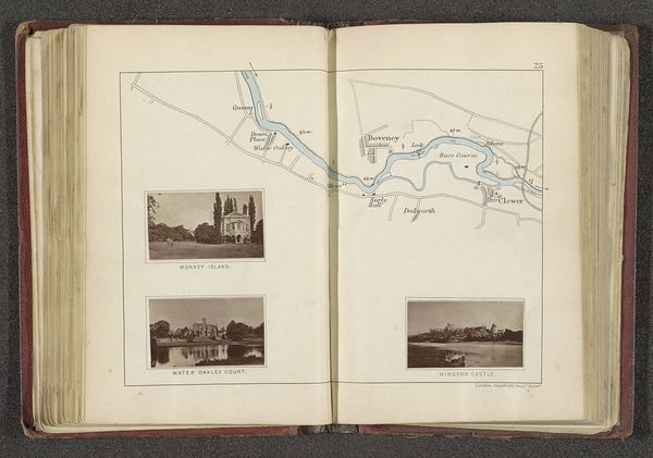 Editor: This is "Kaart met vier afbeeldingen van plaatsen langs de Theems in de buurt van Oxford" (Map with four images of places along the Thames near Oxford) created before 1879 by Henry W. Taunt, using watercolor and coloured pencil. It's an open sketchbook page, with both a map and scenic vignettes. What really stands out to me is the blend of practicality and artistry. How do you interpret this work? Curator: The immediate impression is one of layered meaning. Beyond the geographical precision of the map and the picturesque scenes, this image acts as a memory palace. Notice how the River Thames isn’t merely a waterway but a vein connecting the heart of Oxford with its surrounding landmarks. Consider, too, that the very act of mapping has a long, often fraught history; what symbolic weight does the artist attach to each included location, and each *omitted* one? What’s privileged and why? Editor: So the placement and selection hold significance beyond just depicting the area? Curator: Absolutely. Water, especially a river like the Thames, carries powerful connotations: flow, time, change. The vignettes—High Street, the river and boats, Iffley Mill— aren’t neutral observations. They represent, in visual shorthand, specific experiences, social spaces, perhaps even political affiliations. Can you sense how this “storyboard and sketchbook work” is more than just observation and planning, it also acts as an aesthetic and sentimental interpretation? Editor: I see what you mean! It is as though the artist attempts to capture the entire experience of Oxford. It’s a personal, historical, and even emotional cartography. Thanks, that's so helpful to understanding the deeper layers of meaning here. Curator: Precisely! These older, topographical representations can offer such potent access to personal and cultural symbolism.