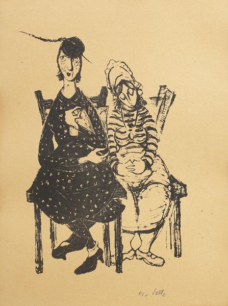 Curator: Well, hello there. Are you ready to meet some interesting characters? I’m looking at a drawing called "Fusie liberale partijen" from 1921, by Patricq Kroon. Editor: Hmm, quirky. Like something you’d find scribbled in a mischievous political cartoonist’s sketchbook. Kind of delightfully off-kilter. Curator: Exactly! Kroon's drawing uses ink to create these caricatures. What are your eyes drawn to first? Editor: Definitely those expressive faces! Each one seems to radiate a different flavor of… skepticism? The composition, almost symmetrical, draws you right into their… suspicious gazes. Curator: I read this piece as a visual pun, if you will. A lighthearted commentary about the fusion of liberal parties in the Netherlands. The figures even have names beneath them: Dresselhuys, Treub, Rink, and Orion. Editor: Ah, clever! So the exaggerated features and, let's be honest, slightly ridiculous outfits, are all part of the satire? Is the artist suggesting these political unions are a bit of a costume drama? The woman on the left clutching a bag with the word “conservatisme” certainly gives that impression. Curator: You got it! The bag itself hints at the weight and burden carried, or perhaps clung to, by those more conservative factions within the liberal parties. Treub holding an economic bond? Wonderful touch. Editor: There is some fantastic attention to surface here; that fur stole looks almost palpable in places and falls away in inky shadow on the lower right. Even in monochrome there's this playful materiality to it all. But tell me, does it work? Does the visual metaphor elevate beyond just a period joke? Curator: It’s got layers. I see it as Kroon capturing the spirit of political negotiation. I think anyone who has tried herding cats during collaborations will find resonance here! Editor: Well, I definitely felt a giggle rise to the surface. Its accessibility, I think, helps transcend any historical specificity, a quality shared across compelling caricature traditions. Curator: Spot on! Caricature is not simply about likeness; it amplifies essences of an original form. It's fascinating how an artist teases out character in mere ink. Editor: Agreed, an absolute gem and an interesting work to analyze in detail! A perfect way to see character brought to life through line, form, and well observed social cues.