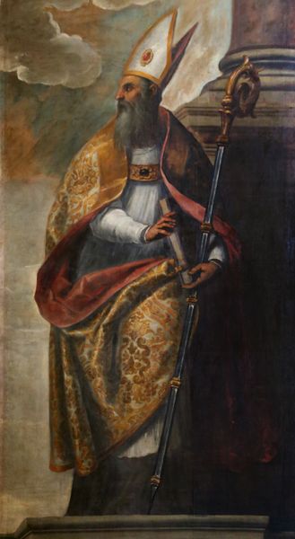 Curator: Before us hangs El Greco's "St. Ildefonso," completed around 1613. Editor: Striking! The elongated figure and swirling sky create an otherworldly feel. The texture in the robe seems almost palpable, and how the greens interact with the yellows is unusual. Curator: It's quite characteristic of his late period. El Greco, though born in Crete, was deeply influenced by the Venetian and Roman traditions before settling in Toledo. We can consider this work a fascinating amalgamation of various influences. Think about how the painter approached this work using oil paint. What sort of training and labor goes into producing paintings such as this one? What was his workshop like? These are the questions I'm always interested in, how his life and process informed what's put on the canvas. Editor: Yes, Toledo provided fertile ground for his highly individual style. I find it particularly intriguing how he used contrasting colours and distorted proportions to convey a sense of religious ecstasy. Looking at how his body elongates within the frame contributes to the idea of his divinity. Curator: His patronage is crucial as well. This piece was, after all, commissioned for a church. Considering who purchased his paintings and who viewed them will enhance your appreciation. I suspect it had some symbolic use related to Catholic reforms being instituted in Toledo during that era. What the consumers thought about him would provide a wealth of information. Editor: Absolutely, though one cannot overlook the technical mastery at play. Note the swirling patterns of paint which draw your eye upward. They contrast magnificently with the saint's serene face. Even with the lack of naturalistic proportion, there's such incredible control here that leads the viewers through every part of his outfit. Curator: In conclusion, understanding both the labor that goes into its material construction and how religious fervor was taking over Spanish society at this point allows viewers to connect with history at large, through a single man standing. Editor: I agree. Close observation reveals not just an image of St. Ildefonso, but the inner world that Greco constructed and poured out. It has so much more to tell those who know how to see.