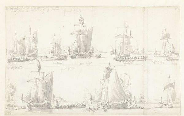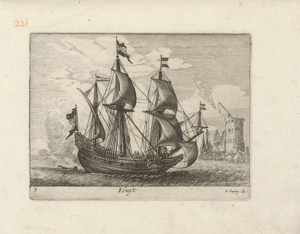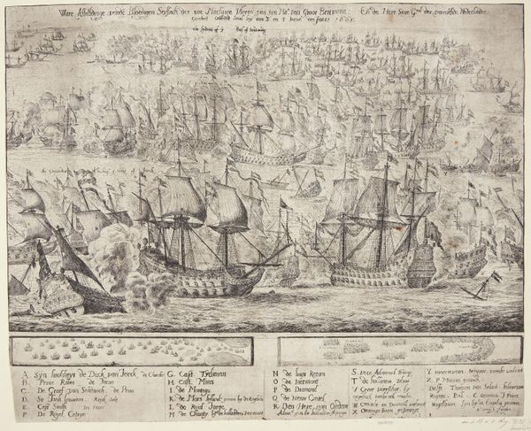 Adriaen Matham created this etching titled "Terugkeer van de vloot onder bevel van Pieter van den Broeck" in 1630. The composition presents a fleet of ships arrayed across a tranquil sea, rendered in delicate lines and subtle gradations of tone. This meticulous rendering captures the ships’ structures and the textural nuances of the water and sky, evoking a sense of maritime order and serenity. The formal arrangement of the ships, spaced evenly, suggests a carefully constructed tableau rather than a chaotic scene of arrival. Matham's print invites us to consider how such depictions construct and reinforce notions of maritime power. Consider how the symmetry and precise detailing function as symbolic devices. Rather than simply representing a historical event, the image presents a calculated vision of Dutch naval prowess, emphasizing control and authority through its structured composition.