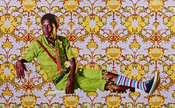 Editor: We're looking at Kehinde Wiley's "Portrait of a Florentine Nobleman," created in 2018 using acrylic paint. I'm immediately struck by the vibrant tension between the figure and the decorative floral background. What catches your eye as you examine its formal qualities? Curator: The interplay between flatness and depth is key. Wiley utilizes a complex pattern which, while visually arresting, risks overwhelming the figure. Consider how the figure’s striped garment both clashes and harmonizes with this ornate backdrop. Editor: It's almost camouflage, isn't it? How does the contrast affect our reading of the subject? Curator: Precisely. Note also how the figure's skin is rendered: the subtle shifts in tone. Then compare this approach with the even, almost mechanical repetition of elements within the background. This difference, what does it suggest to you regarding Wiley's formal strategies here? Editor: I guess it emphasizes the individual, while almost satirizing the idea of inherited status. Curator: An astute observation. Focus, now, on the composition as a whole: Wiley’s utilization of pictorial space. Do you perceive any areas where the formal structure appears deliberately strained, perhaps even destabilized? Editor: Now that you mention it, the vine motif that seems to wind around the figure almost feels like it's trying to contain or restrain her within the picture plane. Curator: An intriguing point. Such visual dynamics provoke us to question assumptions of power and representation within the language of portraiture itself. Editor: So it's less about who is portrayed, and more about how. Curator: Indeed. The how *is* the who, in a sense. By emphasizing the artifice, Wiley compels a reevaluation, moving beyond superficial representation toward something far more structurally engaged. I learned to perceive it less like a portrait and more like a critical commentary through contrasting styles.
