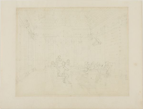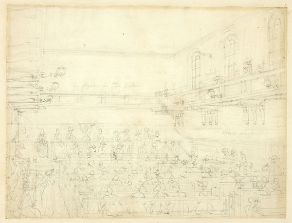 Augustus Charles Pugin created this study for "Drawing from Life at the Royal Academy, Somerset House" with graphite on paper. The composition is structured by the contrast between the open space of the foreground and the density of figures and objects in the background. Pugin’s use of line is delicate, almost tentative, creating a sense of depth through varied line weights. The diffuse lighting suggests the room is a stage for observation and learning. The drawing captures a moment within the Royal Academy, a space dedicated to the codification and transmission of artistic knowledge. The arrangement of figures, with the nude model elevated and surrounded by artists, reflects a hierarchy of looking and being looked at. This echoes broader structuralist ideas about how systems of representation reinforce social roles and power dynamics. The drawing is more than a mere depiction, it’s a document of the structures that govern artistic production.