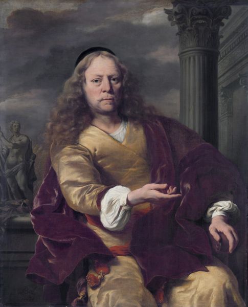 Editor: Here we have Titian's "Portrait of Ariosto," painted around 1510, in oil. It's quite striking how the muted blue of the sitter's garment contrasts against the dark background. What can you tell me about this piece? Curator: Note the geometry in the arrangement. The soft curve of Ariosto's figure mirrors that of his hat. It is a clear visual motif. But observe closely: Titian's brushwork seems almost invisible. It isn't about the painter's ego; rather it prioritizes presenting a clear, undistorted vision of Ariosto. The texture of the jacket hints at depth while the solid block at the bottom firmly grounds the composition. Does that structural decision inform how you view the subject? Editor: It makes him seem very present, despite the lack of dynamic action. What I am trying to say is, the painter invites me, even, compels me to observe more attentively, the expression on Ariosto's face, his attire, every structural detail! Curator: Exactly! It is in the restraint and deliberate visual encoding that Titian conveys respect and draws us closer to a particular man. Editor: I see. The lack of flashy brushwork and overt symbolism focuses attention on the portrait's pure, unadulterated visual form. It really prompts a new level of attentiveness in the viewer! Curator: Yes, and such refined observation will always bear fruit with Titian.