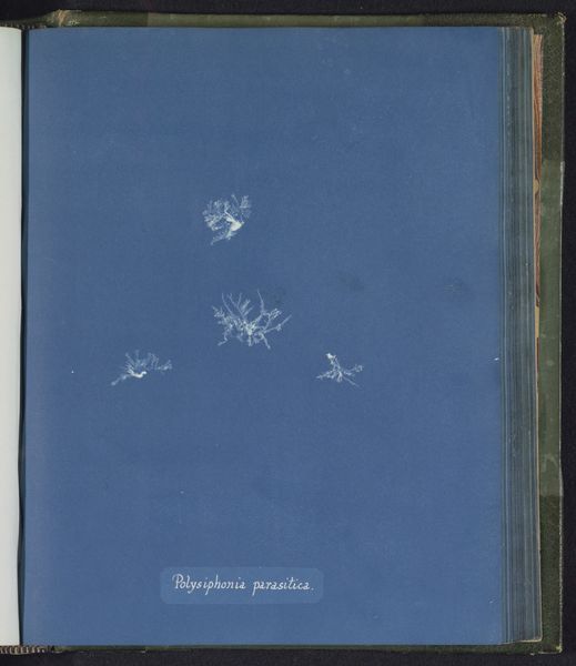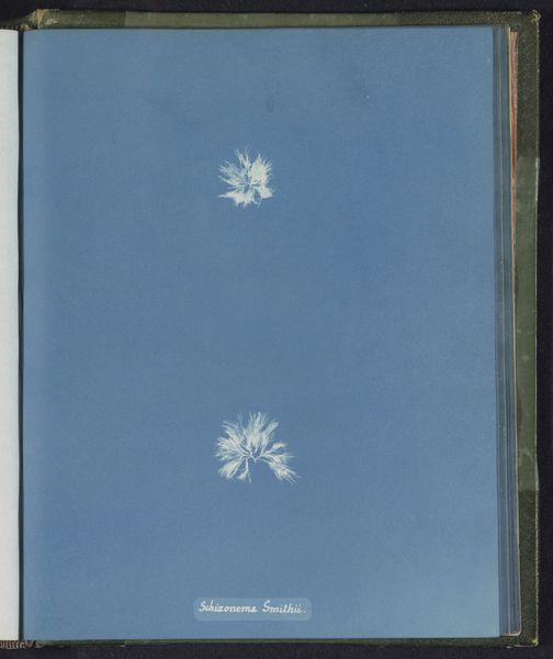 Anna Atkins made this cyanotype of Sphacelaria radicans, a type of seaweed, using a photographic printing process that results in a distinctive blue hue. The composition strikes a balance between scientific precision and artistic abstraction. The stark white, cloud-like forms of the seaweed float against the solid blue ground, creating a ghostly, ethereal quality. Each specimen is carefully arranged to highlight its delicate structure. Atkins’ method elevates the plant to a new level of observation and appreciation by employing photography, a scientific tool, in the service of art. The very process of cyanotype printing—placing the object directly onto sensitized paper and exposing it to light—foregrounds the object's form. By using this cameraless technique, Atkins challenges traditional modes of representation. This work functions not just as a botanical study, but also as an exploration of form, texture, and the relationship between art and science.