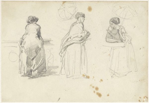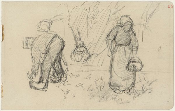 Editor: This is John Singer Sargent's pencil sketch, "Woman at Market." It’s a quick study of women selling goods. What do you make of it? Curator: It offers a glimpse into the lives of working-class women, likely in Europe. How does Sargent's sketch reinforce or challenge existing notions about women's roles in society at the time? Editor: It feels very observational, almost detached. Does that relate to the politics of representation? Curator: Exactly. Sargent, as an American expatriate, occupied a unique position observing European society. This distance is reflected in the sketch's somewhat clinical depiction. It invites us to consider the power dynamics inherent in looking. Editor: That gives me a lot to think about, especially considering who gets represented and how.