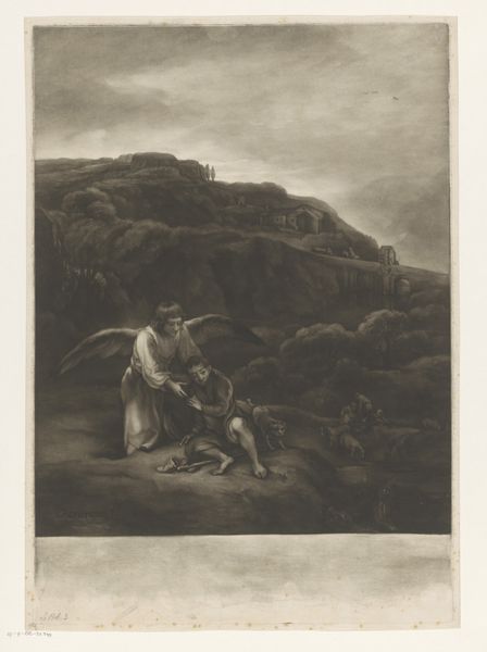 Editor: So, this is "Hagar and Ishmael in the Desert" by Alfred Louis Bahuet, created around 1885. It appears to be an engraving, and the overwhelming feeling I get from it is…desolation. A vast, empty landscape and figures that seem consumed by despair. What resonates with you when you look at this? Curator: Desolation, yes, a poignant scene drenched in Romantic drama! Bahuet really captured that feeling. See how the landscape almost mirrors their emotional state? It's all harsh light and shadow. But it makes me think – what is *causing* that despair, specifically? The figures are central; mother and child at what feels like breaking point. Editor: Presumably thirst and exhaustion in the desert? It seems like a literal interpretation of being cast out and left to die. Curator: Precisely! This piece echoes the Old Testament story. But Bahuet isn't just illustrating a Bible story. He is making you *feel* it, isn’t he? The averted gaze of Hagar – it speaks volumes. Almost unbearable to look at, she hides her face not from us, but so her child does not see her weeping. It gives it all an extremely deep and intense, inward quality. Editor: So the Romantic style is more about evoking emotion and intensity rather than, say, historical accuracy. Curator: Absolutely! And think about the landscape! Is it an objective portrayal of the desert? Or does it amplify the mother's inner turmoil, projecting feelings of isolation into nature? Does that not maybe remind you of Caspar David Friedrich? Editor: It really does now that you mention it, but a lot grittier. Curator: Right? And that little detail of the discarded water flask really drives home the despair – quite a dramatic flourish, I think! Something almost theatrical about it. I feel the theatricality is at war with that inward sensation, that private desperation that seeps off it. What do you think, has it made you reconsider it? Editor: Definitely. Seeing it as less about a story and more about the emotional weight…it changes everything!