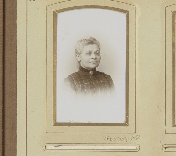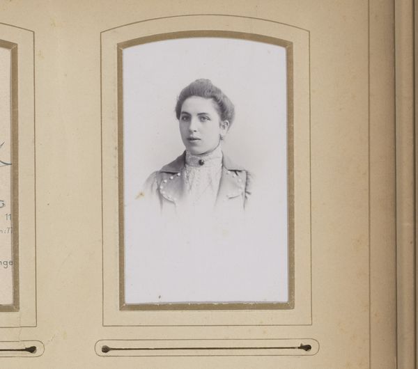 W.G. Kuijer & Zonen created this diminutive portrait of a young woman using photographic methods. Notice the formal arrangement: the woman is centered, her gaze directed towards the viewer, framed by a decorative border. The use of light and shadow is carefully managed to create a soft, almost ethereal effect, emphasizing her features while maintaining a sense of decorum. The composition adheres to established conventions of portraiture, yet the image also hints at a modern sensibility. The subtle gradations of tone, from the stark white background to the darker shades of her dress, create depth and texture. How does this interplay between tradition and modernity in terms of representation challenge fixed notions of identity? It invites us to consider how the formal aspects of the photograph contribute to its cultural significance.