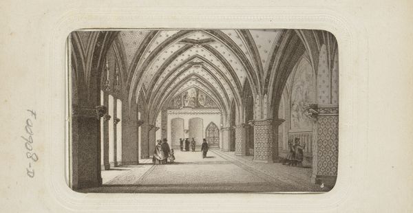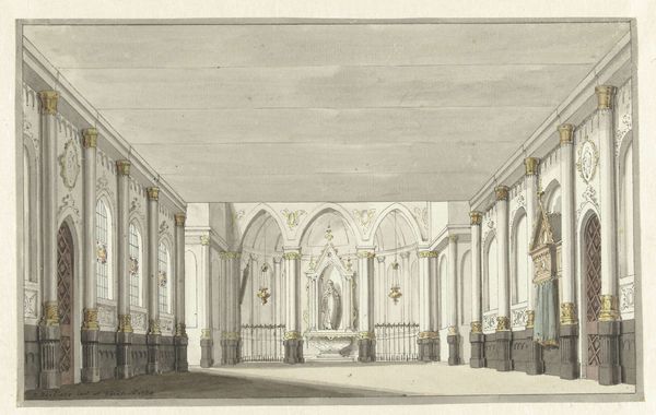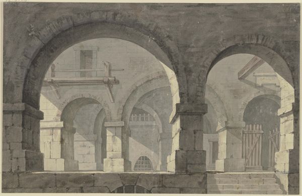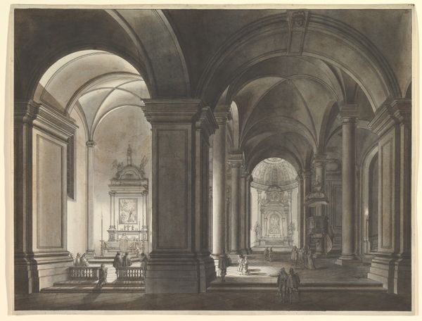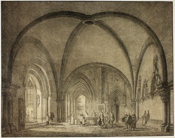 Curator: What a captivating scene! We're looking at a drawing entitled "A View in San Lorenzo Fuori le Mura, Rome," created around 1820 by Gustav Friedrich Hetsch. Editor: Immediately, I’m struck by the hushed reverence evoked. The somber sepia tones lend it the feel of a faded memory, almost dreamlike, despite its architectural precision. Curator: Precisely. Hetsch was working during the rise of Neoclassicism, and this piece perfectly exemplifies the movement’s interest in depicting historical settings, reflecting an admiration for antiquity and the revival of classical forms. He would have studied how grand, historical narratives could be expressed in contemporary artwork, feeding the public appetite for visualizing a monumental past. Editor: Notice the arches—recurring throughout religious art for centuries; they lead the eye and suggest an almost unending path. Here they speak to permanence, don't they? It seems as though even as some portions of the depicted architecture erode, these people find comfort and assurance from what stands as its unchanging essence. Curator: Absolutely, and this basilica held great symbolic significance in early 19th century Rome. It had already experienced multiple renovations across the centuries and stood as a potent symbol of continuity within the Catholic Church despite ever-changing geopolitical winds. By the time Hetsch produced this drawing, Rome and its artistic patronage had undergone fundamental disruptions amid the Napoleonic wars. The public consumption of religious iconography acquired new social and political valences in that volatile context. Editor: Observe how the figures seem absorbed, either in prayer or contemplation; Hetsch is guiding us through his imagery and inviting us to do the same in person. I feel I understand how they view this setting, the emotion the space carries for them and me. Curator: Indeed. And rendered as a drawing and print, a readily reproducible medium, the Basilica is conceptually unshackled from Rome and made available to broader audiences beyond Italy. It provided 19th-century consumers a connection to history. Editor: And what powerful history it portrays! Curator: This offers insight into the dynamic interplay between art, religious spaces, and early 19th-century society. Editor: Definitely something I'll be considering during the rest of my visit to San Lorenzo!