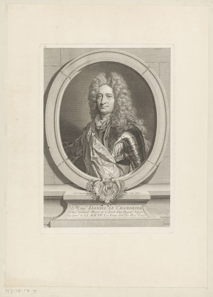 Curator: Here we have a work by Georg Friedrich Schmidt, titled "Portret van Joseph Parrocel," created in 1737. It's an engraving, a type of print. What's your initial take on this piece? Editor: Oh, it’s interesting! I am immediately drawn to the hair. That Baroque cascade of curls feels… flamboyant. It gives him a kind of playful defiance, set against that very proper oval frame. There's a lot of empty space around him though... a feeling of the person adrift. Curator: It's a study in contrasts, certainly. Consider the labour involved in creating an engraving like this. Every line, every gradation is deliberately etched. It was a process of skilled craftsmanship and exacting reproduction, deeply rooted in the printmaking traditions of the time, before the dominance of cheaper, faster processes. And engraving allowed for widespread circulation. Editor: It does feel very intentional. Like a performance of portraiture rather than a direct glimpse. You know, the way the subject’s gaze seems to catch yours, it is if Parrocel the artist and Parrocel the sitter have had a conversation, then included you as a polite witness! There's such detail worked in through, creating shape. And the stark medium amplifies those details wonderfully. Curator: Absolutely. The choice of engraving as a medium allowed for dissemination. Prints democratized art to an extent, making portraits and other images available to a wider audience. They also fulfilled a role similar to that of photographs today – commemorating individuals and spreading their likeness. The materiality matters. This wasn’t an original painting only for the elite, but an image intended to circulate and be consumed. Editor: That's such an interesting perspective, framing prints as an early form of media. It makes me consider what is omitted by contrast. What details were seen, or perceived by contemporaries, and left on the cutting room floor by Schmidt? Maybe his intention was more informational or biographical! Curator: It’s the beginning of the art celebrity culture. Georg Friedrich Schmidt makes Joseph Parrocel into a brand, creating accessible artwork in a time without cameras. Editor: Seeing it that way enriches the picture. And, look, now I cannot unsee Joseph Parrocel's cheeky look on his face! Curator: A powerful piece reflecting both artistic skill and its place in a broader material and social context, even several centuries after it was made. Editor: It truly invites consideration to how it came to be and invites questions about context and dissemination - all from the most careful set of lines and details!