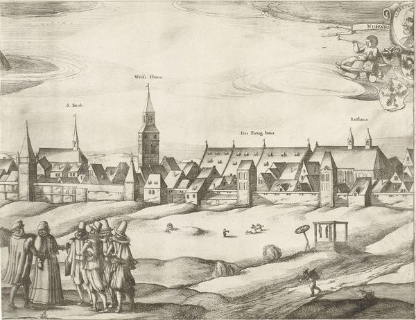 Curator: Here we have "Gezicht op Neurenberg (blad 2)," or "View of Nuremberg (sheet 2)," an engraving dating back to 1666. It resides here with us at the Rijksmuseum, created by Dirk Eversen Lons. What's your immediate take on it? Editor: Bleak, somehow…but orderly! The crisp lines make it seem like Nuremberg’s being presented as a model city, yet there’s this unsettling, almost ghostly stillness to it. It feels less like a celebration and more like a…documentation? Curator: An interesting observation. The engraving medium itself lends to that crispness and detail. Printmaking at this time was booming in the Netherlands, and views of cities were quite popular, fulfilling desires for knowledge and also civic pride. Prints circulated widely and influenced how people imagined cities, even those they hadn't seen. Notice also the figures in the upper corners, above the town, what do you make of that? Editor: Whoa, I didn't even spot those at first! Africa and America are literally floating in the sky over Nuremberg like guardian spirits—or maybe just decorations on a particularly elaborate cake! Curator: More than decoration, I suspect. Representing continents alongside the city serves to magnify Nuremberg’s place in a larger world, or at least a worldview. By associating it with the known continents, the artist is connecting the city to broader themes of trade, exploration, and the flow of knowledge. Editor: You know, now I'm noticing this decorative cartouche too. At first it felt kind of tacked on, but it's all part of framing Nuremberg as… important, cultured, connected. But it does feel forced, like propaganda in pretty clothes. I get this urge to see the grittier truth! Curator: Well, perhaps the art wasn't striving for grit in the first place, but order. Keep in mind that artists responded to market demands. Editor: I suppose. I see it, that structured world…but give me chaos! Though, in its own way, the careful control in the rendering makes you ponder what's being left out of the view. Food for thought! Curator: Precisely. It is through these controlled images that the socio-political influences become visible. That is where our interpretation has an interesting role to play!