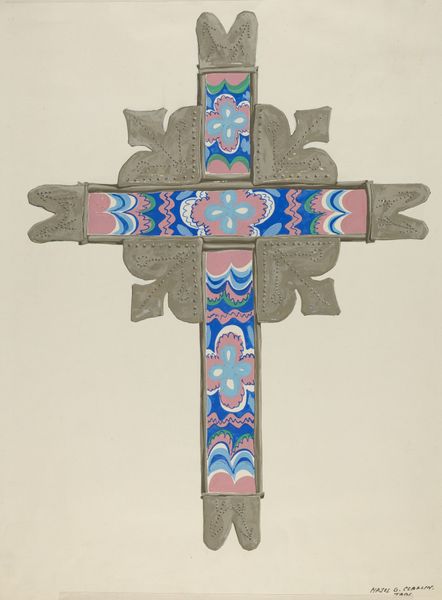 Editor: Here we have Carl O'Bergh's "Cross," dating from around 1939. It's a charcoal and colored pencil drawing on paper, presenting what looks like a wooden cross. I'm struck by the detail in the geometric patterns embellishing it. How do you interpret this work purely from a visual perspective? Curator: The form itself immediately suggests the essence of the piece. Notice how the artist uses repeated geometric motifs, almost like an indigenous textile pattern, to adorn the surface of the cross. It invites a semiotic analysis. What do these repetitions communicate beyond simple decoration? Editor: Perhaps a sense of ritual or tradition? It definitely moves past the basic symbolism of the cross itself. Curator: Precisely. The horizontal and vertical lines of the cross are visually interrupted by these patterns, almost fragmenting the inherent symbolism. In terms of structure, the application of color, a warm tan set against the dark charcoal, enhances the depth and the tactile sense. Do you perceive a tension in the use of such primitive markings applied to a Christian symbol? Editor: Definitely. It’s as if O'Bergh is trying to merge cultural signifiers into one form, but through the geometric vocabulary and rendering the cross takes on almost an abstracted tribal object. Curator: And abstraction leads us to question the artist's intent. It’s important to note how form takes precedence over iconographic content. He has clearly deconstructed a religious symbol, offering an alternative visual interpretation rooted in design rather than direct religious sentiment. A challenge to our perception of signs. Editor: So by focusing on line, shape, and pattern, O'Bergh creates a cross that is about design, rather than solely about its conventional symbolism. It highlights form and visual experience first and foremost. Curator: Yes, and by engaging with its purely aesthetic components, we're challenged to redefine our understanding of visual communication in its most fundamental guise. Thank you for your insights, Editor. It has been insightful exploring this artwork together through the lens of form and design.