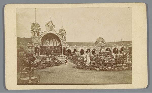Curator: Here we have "Interieur van het Paleis voor Volksvlijt, Amsterdam, tijdens een nijverheidstentoonstelling of westrijd(?) in 1892", a fascinating photograph from E. van Elfrinkhoff. Editor: It’s breathtaking in scale. That soaring, skeletal ironwork—the high vaulted ceilings give a real sense of awe. Curator: Yes, it perfectly captures the spirit of 19th-century industrial exhibitions. But what resonates deeply is the imagery, especially within that central, domed structure. Do you perceive it as a secular temple to industry, almost mimicking a reliquary? Editor: Absolutely! The symmetry is impeccable, it creates the feel of a sanctuary. Notice the carefully arranged displays of goods that look like offerings to the gods of progress? It presents commercial enterprise almost as a civic religion. Curator: Indeed. Observe how the eye is guided upwards by the converging lines of the architecture, focusing attention on this... alter of commerce. There is an attempt to elevate earthly goods to an almost spiritual domain. It also reminds me of the Great Exhibition in London 40 years prior; can this place be seen as a trace of an old-fashioned desire of progress, almost out of place with the rise of pictorialism? Editor: It's such a poignant commentary on the ideals of the age. Though made in a modern photographic process, it harks back to classical imagery, with columns mimicking Greco-Roman temples, symbolizing civilization and human achievement through progress. Curator: Note how the photographer expertly manipulates depth of field and contrast; these principles contribute to the aesthetic value while subtly shaping our perception of the exhibited wares, too. I believe this image encourages a reflection upon these ideals during a time of transformation in artistic representation. Editor: An examination of an architectural space reveals its hidden symbolic structure, just beneath the surface appearance, while inviting the visitor to reflect on modernity. Thank you! Curator: A fascinating convergence of industrial aesthetics and enduring symbolic power!