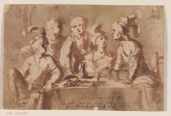 Editor: This is “Les Deux Baisers” by Louis Philibert Debucourt, from 1786. It's a print, and the scene is wonderfully busy, capturing a moment of supposed intimacy disrupted by an… admirer? I’m curious about the dynamic at play here. How do you interpret this work? Curator: It's fascinating to view Debucourt’s print through the lens of social critique. We see not just a snapshot of affection, but an engagement with the public consumption of images and, dare I say, scandal. Consider the period—the late 18th century in France was obsessed with appearances, fashion, and elaborate social rituals. The presence of the painter and the painting within the print emphasizes the role of art in not only mirroring but constructing and circulating such images and ideas. Is it private, really, when captured on canvas? Editor: That's a good point. The painting-within-the-painting makes you wonder about constructed realities and public perception of private moments. What's with all the wigs? Curator: The elaborate hairstyles are not mere decoration. These high hairstyles speak to status, wealth, and engagement with current fashions but also raise the stakes within the power dynamics displayed. How might we analyze the gendering implied, where men invade, and women watch passively? Does that match a trope we know? Editor: Interesting. It's almost as though everyone is performing. Thank you. This definitely changes how I see it; it is less a romantic image and more of a comment on social performance, isn't it? Curator: Precisely! And considering that these prints were widely circulated and consumed by the public, the art itself participates in this very same cycle of spectacle and social commentary. I've learned as well how complex that social world must have been.