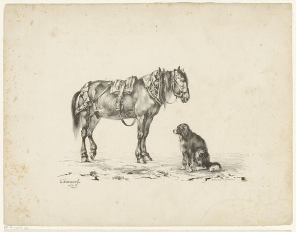 Hendrik Jozef Franciscus van der Poorten created this etching, "Horse and Two Cattle," sometime in the early to mid-19th century. The etching process involves coating a metal plate with a waxy, acid-resistant material, and then drawing an image into that surface with a sharp needle. When the plate is exposed to acid, the drawn lines are etched into the metal. The plate is then inked, and the surface wiped clean, leaving ink only in the etched lines. Finally, the plate is pressed against paper to transfer the image. The resulting print has a distinctive character: a certain delicacy, and an even, all-over quality. In this case, the evenness makes the farm animals seem almost dreamlike, part of a continuum of landscape and atmosphere. Van der Poorten’s choice of etching, a relatively accessible printmaking technique, speaks to a desire to depict rural life and labor, embedding the work in a wider context of agrarian production. The very act of reproducing the image democratizes its consumption. It reminds us that the making of art, like the labor of farm animals, is always embedded in the social and economic conditions of its time.