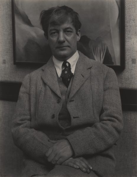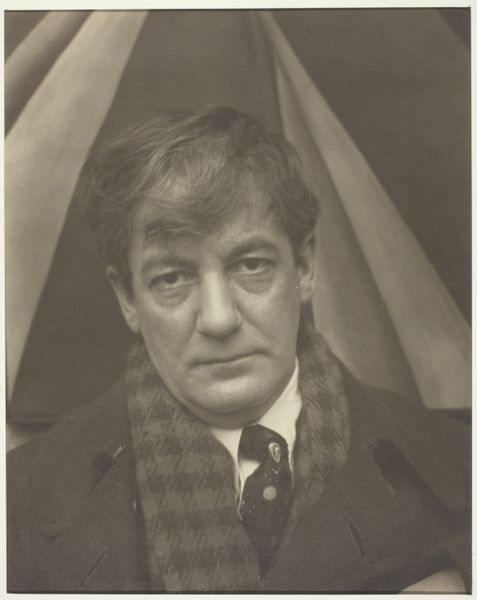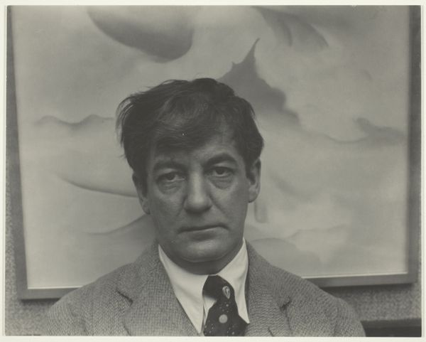 Editor: Here we have Alfred Stieglitz's photograph of Sherwood Anderson from 1923. The high contrast and shallow depth of field really draws you in; it’s got this very direct, almost confrontational feel to it. What's your take on this portrait? Curator: You know, I've always found it to be incredibly intimate, wouldn't you say? Stieglitz has this uncanny ability to capture the essence of his subjects, almost like he's peering directly into their soul, no? Look at the soft light caressing Anderson's face and notice every subtle line etched around his eyes – they're like stories, little fragments of experience waiting to be told. Do you think it’s revealing something about Anderson the writer? Editor: Absolutely, it does! He looks both world-weary and incredibly wise, like he's seen a lot but still holds a certain amount of… hope? Maybe naiveté? It’s hard to put my finger on it. Curator: Yes, precisely! And you feel this complexity because Stieglitz doesn't present us with a simple image. It’s this perfect tension that elevates the portrait beyond just a likeness; it becomes a profound statement about humanity. The slight blurriness around the edges somehow reinforces this ephemeral quality of existence, don’t you think? Editor: I do! It’s almost dreamlike. It makes you wonder about their relationship too. What was it like to be in that room, under Stieglitz's gaze? Curator: Ah, a good question! Knowing Stieglitz, I'm sure it was an intense encounter. I always walk away from his work with this renewed appreciation for the power of photography to be both deeply personal and universal. Editor: I agree; it’s fascinating how a single image can hold so much.