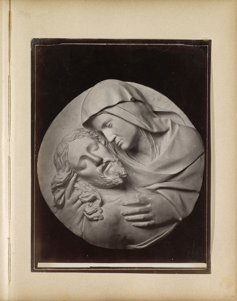 Curator: What a striking image. There’s a profound sense of quietude here. Editor: Indeed. This is a photograph from between 1900 and 1960 by J. Christophe. The work shows a view of a sculpture, a bust of Christ. Note how one hand gestures in blessing, while the other holds a globus cruciger, a symbol of earthly power. Curator: What grabs me immediately is the texture. The photograph captures the subtle imperfections, the almost weathered look of the sculpture itself. You can almost feel the sculptor’s touch, the tool marks in the material, like roughhewn stone, or maybe plaster? And the light – it emphasizes every contour, every slight imperfection. Editor: From an art historical perspective, consider the power dynamics at play. The globus cruciger was commonly seen in imperial and royal portraiture. So, by presenting Christ with this object, the artist is deliberately imbuing a religious figure with worldly authority. Curator: Absolutely. And thinking about it materially, the choice to render this in sculpture, and then photograph it, adds layers of meaning. The sculpture itself is a manufactured object, crafted by hand. Then it’s further processed through the lens of the camera. It shifts the meaning of craft and replication of icons. Editor: And the decision to present it as a portrait speaks volumes about how religious figures were, and continue to be, represented and consumed. These images served a purpose – they reinforced societal norms, communicated authority. Curator: There's something hauntingly beautiful about this photographic study of the bust of Christ. Editor: For me, this piece highlights the lasting power of visual representation, and how, through material choices and cultural context, art serves as a mirror reflecting and shaping our understanding of faith and authority.