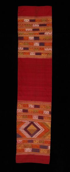 This ceremonial scarf, of unknown date, was made by the Tai people. The composition of the scarf is dominated by horizontal bands of alternating color. The warm hues of crimson and gold evoke feelings of dignity. The scarf is adorned with geometric patterns in the form of small triangles. Consider the scarf's structure: the repetition of horizontal lines and triangular motifs suggest the importance of balance and rhythm. The fringe at both ends adds a tactile dimension to the design, inviting touch and interaction. These aesthetic features emphasize the significance of the scarf as an object of adornment and cultural identity. The scarf can be understood as a form of visual language, where design elements serve as signs conveying complex ideas about community and status. Through its use of color, pattern, and form, the scarf embodies a rich cultural heritage, inviting us to consider the interplay between aesthetics and cultural expression.