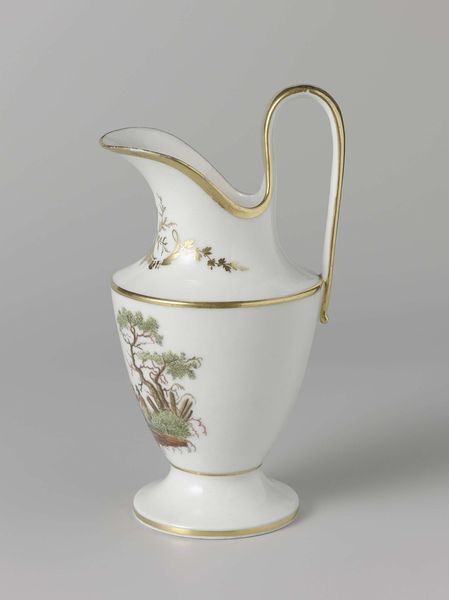 Editor: Here we have a porcelain sugar bowl, crafted around 1809-1814 by Koninklijke Porseleinfabriek Dommer & Co. The decorative details, like the baskets and ribbons, give it such a playful feel. How would you interpret the cultural significance of such a piece? Curator: This object speaks volumes about the social rituals of the time. The presence of a decorated sugar bowl suggests an emerging culture of leisure and conspicuous consumption amongst the Dutch elite. Consider how the very availability of sugar—once a luxury—had transformed, shaping new social customs around tea and coffee drinking. These weren't just beverages, they were social currency. Editor: So, it's less about the bowl itself and more about what it represents? Curator: Exactly. It's about understanding how objects like this functioned within a broader system of social display and economic power. Porcelain itself was a prized material, and its use signifies wealth and access to global trade routes controlled largely by colonial powers. Note how the hand-painted decoration emphasizes crafted skill, visually asserting its exclusive status. How might a piece like this have affected, or reflected, social status in the Netherlands? Editor: I guess owning such a finely made object would have immediately placed a family higher on the social ladder, reflecting good taste and affluence. It makes me think about modern-day luxury goods and the same principles still applying. Curator: Precisely! Studying this sugar bowl lets us see how material culture helped establish and reinforce social hierarchies of the early 19th century. Editor: That’s really insightful. I hadn't considered how a simple sugar bowl could tell us so much about social dynamics. Curator: Indeed, it shows us how everyday objects can act as powerful mirrors, reflecting a society's values and structures.